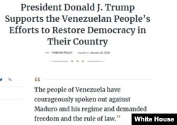 A continuación reproducimos el documento titulado "Presidente Donald J. Trump apoya los esfuerzos del pueblo venezolano para restaurar la democracia".