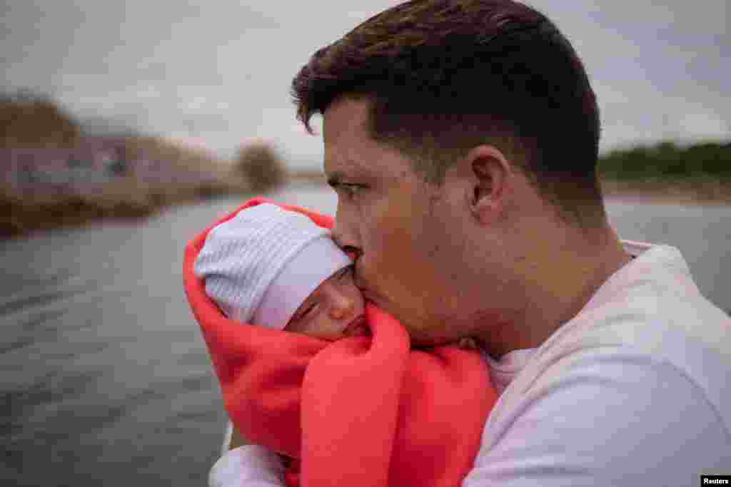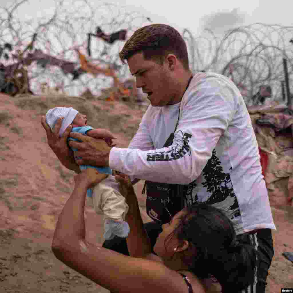Yusniel, un migrante cubano de 34 años y su esposa Yanara, de 30 años, fueron fotografiados mientras cruzaban la frontera de México y Estados Unidos con su hijo Yireht, de diez días de nacido. Esta familia hizo el cruce fronterizo atravesando el río Grande en Eagle Pass, Texas, el 6 de octubre de 2023.